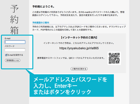 管理者(各店舗・施設)が、ネット予約システム「予約箱」において、管理画面にログインする際の紹介および手順です。