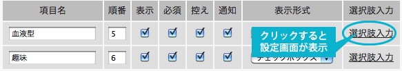 (1)選択肢を設定したい項目の一番右にある「選択肢入力」をクリックしてください。